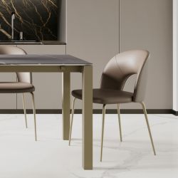 Die breite, gepolsterte Rückenlehne besticht durch ihre halbrunde Form mit zentraler Öffnung , die optische Leichtigkeit und ergonomischen Komfort verleiht.