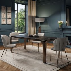 Diamond zeichnet sich durch seine einzigartig geformten Metallbeine aus, die in verschiedenen Ausführungen erhältlich sind. Das Gestell wird mit einer rechteckigen Tischplatte aus Melamin, Laminat, Dekorglas oder matter bzw. glänzender Keramik kombiniert.