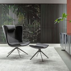 Der Sessel kann optional mit Fußstütze und in einer Doppelbezugsversion bestellt werden, wobei die Rückseite aus echtem Leder und die Vorderseite aus Stoff oder Leder in einer anderen Farbe besteht.