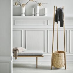 Diese Garderobe im nordischen Design ist eine vielseitige und multifunktionale Ergänzung. Die Struktur aus Eichenholz wird durch einen handgeflochtenen Weidenkorb ergänzt, der als Schirmständer und Behälter für andere kleine Gegenstände dient.