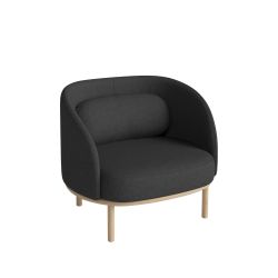 Das in verschiedenen Farben erhältliche Gestell aus massivem Eichenholz wird mit der gepolsterten und gepolsterten Schale kombiniert. Zwei Stoffe zur Auswahl: