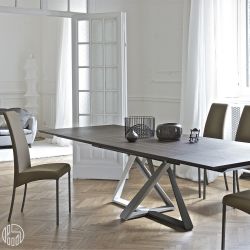 Dieser moderne Tisch hat ein sehr dynamisches Aussehen und eignet sich daher perfekt für moderne Wohn- und Esszimmer. Der Tisch mit zentraler Metallbasis , bestehend aus geneigten und gekreuzten Elementen, ist ausziehbar .