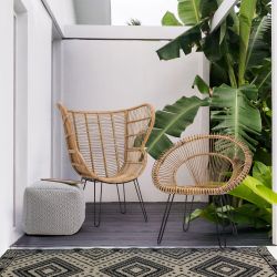 Die Struktur besteht aus schwarz lackiertem Metall und die Sitzfläche ist aus einem einzigartigen , naturfarbenen Rattangeflecht gefertigt.