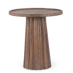 Der Couchtisch Odisha verfügt über eine runde Tischplatte und einen handgefertigten Mittelfuß. Er ist in zwei Farben erhältlich und besteht aus natürlichem oder schwarz gebeiztem Mangoholz.