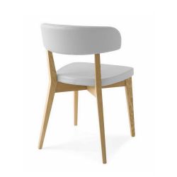 - Gestell aus naturfarben gebeizter Eiche , Sitz und Rückenlehne aus weißem Ekos-Kunstleder ;