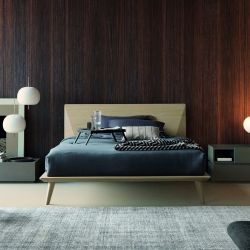 Kiru ist ein Bett mit elegantem Design, mit einer Holzstruktur und einem diamantgeschliffenen Kopfteil. Die Facetten, die das Kopfteil charakterisieren, erzeugen auch am Bettrahmen und den Füßen dynamische Linien.