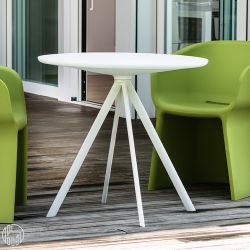 Die Struktur ist aus lackiertem Metall, während die runde Platte (Durchmesser 80 cm) aus recycelbarem Polyethylen ist, passend zu den Tischbeinen.