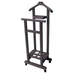 Dieser vielfältige Stummer Diener verfügt über ein breiter Kleiderbügel für Jacken und Hemden, über ein größer Taschenentleerer, über ein praktisches Schuhregal und über vier Rollen, die die Verlagerung erleichtern.