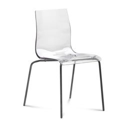 Stuhl mit Gestell aus lackiertem, satiniertem oder verchromtem Metall; Die Schale ist aus transparentem SAN in den Farben: rot, blau, geräuchert oder ganz transparent.