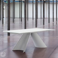 Die Beine aus lackiertem Stahl werden mit einer eleganten mattierten Hartglasplatte oder mit einer keramisch gekoppelten Glasplatte (3 oder 6 mm dick) oder Marmor in verschiedenen Ausführungen kombiniert.
