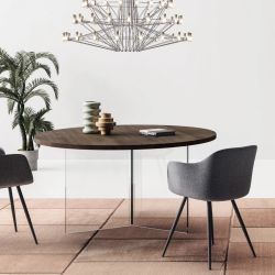 Der Tisch Smart Ring von Devina Nais vereint Vielseitigkeit und Eleganz. Er verfügt über eine edle Tischplatte aus Massivholz mit strukturiertem Eichenholz-Finish, die mit den Beinen der Kollektion kombiniert werden kann, die in einer Vielzahl von Materialien erhältlich sind: Glas, Eisen oder Holz.