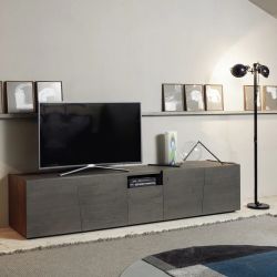 Aus massiver Eiche mit strukturierter Oberfläche. Mit vier Flügeltüren und zwei offenen Schubladen mit Soft-Close-Scharnieren und Schienen. Inklusive Innenregal.