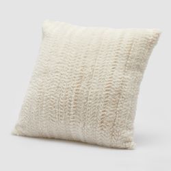 Dekoratives quadratisches Kissen aus offen gewebtem Stoff (Polyester), in der Farbe Naturweiß und mit einer weichen, einladenden Textur.