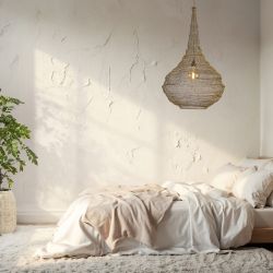 Die tropfenförmige Gestalt und das gewebte Muster des Lampenschirms eignen sich ideal, um Ihrem Zuhause einen Hauch von Exotik zu verleihen.