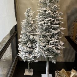 Es zeichnet sich durch die Schneeeffektdekoration aus, die Äste und Stamm bedeckt.