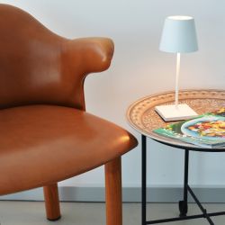 Poldina Mini behält die gleiche Wesentlichkeit im Design bei, was sie zu einer perfekten tragbaren Lampe macht, um die unterschiedlichsten Umgebungen zu vervollständigen: die Leseecke, das Schlafzimmer oder den Entspannungsbereich im Garten.