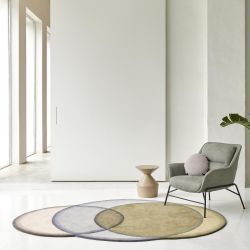 Der Crystal-Teppich zeichnet sich durch seine fließende Form aus, die durch farbige Kreise entsteht, die sich in Bewegung zu überlappen scheinen, wodurch eine dreidimensionale Illusion entsteht und Raum für verschiedene Farbnuancen entsteht.