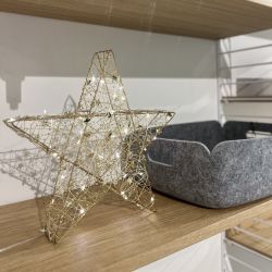 Es besteht aus goldenem Eisendraht und zeichnet sich durch eine Kette aus goldenen LED-Lichtern und kleinen Sternen aus.