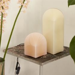Sie hat einen quadratischen Sockel und eine gewölbte Oberseite: Dieses Zusammentreffen der Formen führt dazu, dass die Lampe je nach Betrachtungswinkel unterschiedlich erscheint.