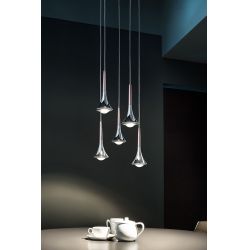Die Leuchten dieser Designer-Pendelleuchte haben eine elegante Form, die an Wassertropfen erinnert. Die geschwungenen Linien der Lampe verleihen der Umgebung eine raffinierte Note, insbesondere im Wohn- oder Esszimmer , wo sie einen überraschenden szenografischen Effekt erzeugen.