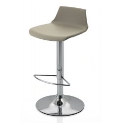 Moderner Hocker mit verchromter Mittelsäule und bequemer Fußstütze. Der Sitz ist drehbar und höhenverstellbar. Er besteht aus sandfarbenem Polypropylen.