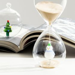 Die Sanduhr aus handgefertigtem, lampengeblasenem Borosilikatglas mit einer Laufzeit von 15 Minuten ist mit bezaubernden Weihnachtsfiguren im Inneren ausgestattet. Der Sand im Inneren ist je nach Modell weiß oder beige.
