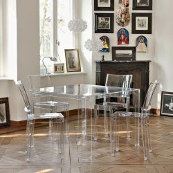 Ein Tisch im klaren, linearen, minimalistischen Design. Invisible Table ist der erste transparente Monoblock-Tisch aus Kunststoffmaterial mit einer quadratischen Platte in 100x100 cm. Dieser Design-Tisch aus Polymethylmethacrylat eignet sich auch perfekt für die Einrichtung des Gartens.