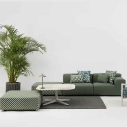Das Sofa Plastics von Piero Lissoni präsentiert sich in einem neuen Look dank der Verwendung von Liberty-Stoffen, die speziell für den Außenbereich entwickelt wurden.