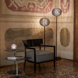 Die Planet-Lampe wird in zwei Farbvarianten präsentiert: aus verchromtem Metall mit transparentem Lampenschirm oder aus lackiertem Metall mit transparentem rauchgrauem Lampenschirm.