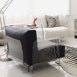 Der Sessel hat ein doppeltes Kissen, Sitz und Rückenlehne, während die Armlehnen aus Polycarbonat unbedeckt bleiben, um ihre süße Krümmung zu zeigen.