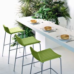 Es besteht aus einem vierbeinigen, lackierten Metallgestell und einem gepolsterten Sitz. Ausgestattet mit einer Rückenlehne, lassen sich bis zu vier Stück hoch stapeln.