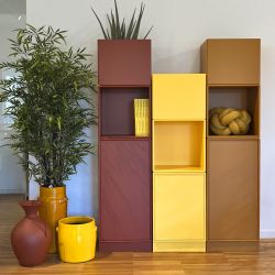 Die Komposition entfaltet sich von unten nach oben: Ein stabiler Sockel, gefolgt von einem höheren Modul mit einer Schiebetür – ideal zur Aufbewahrung von Büchern oder anderen Dingen, die Sie ordentlich verstauen möchten. Darüber bietet ein offenes Modul Platz für Dekoartikel, Accessoires oder Ihre Lieblingsbücher. Das oberste Modul ist in diesem Fall für Vasen vorgesehen und bringt so etwas Grün ins Spiel, wodurch die Komposition lebendiger und natürlicher wirkt.