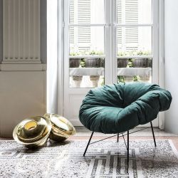 Die Struktur des Sessels ist aus schwarz lackiertem Eisen, während das großzügige Kissen in einer großen Auswahl an Bezügen erhältlich ist.