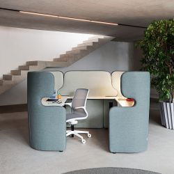 Die Seitenmodule mit Schreibtisch können sowohl in Kombination mit der Trennwand als isolierten Arbeitsplatz, als auch einzeln oder neben anderen Schreibtischen eingesetzt werden. Die hohe Rückenlehne garantiert Schalldämmung und ist daher eine besonders geeignete Lösung für offene Räume oder überfüllte Umgebungen.