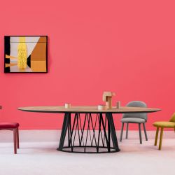 Acco, vom englischen Accordion oder Akkordeon, ist ein Esstisch mit einer massiven, aber leichten Holzstruktur, die an die „Blasen“-Mechanik des gleichnamigen Musikinstruments erinnert: Dünne, leicht gebogene Holzstäbe sind im Zickzack angeordnet.