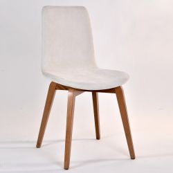 Moderner Stuhl mit Gestell aus massivem Buchenholz. Die 4 Beine verbinden sich in einem zentralen Punkt, auf den der Sitz stützt. Der Sitz und die Rückenlehne sind ein einziges Element, das gepolstert und überzogen ist; die bequeme Sitzschale führt schlichte Linien vor und eignet sich daher sowohl für die Küche als auch für das Wohnzimmer.