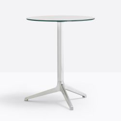 Die verfügbaren Ausführungen des Untergestells sind: lackiert für den Innenbereich, lackiert für den Außenbereich, Glänzend-Aluminium (nur für den Innenbereich) oder Eloxiert-Aluminium (auch für den Außenbereich). Auf Anfrage ist der Tisch auch mit farbigem Gestell erhältlich.