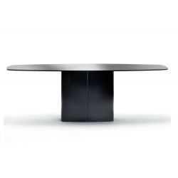 Das zentrale Untergestell ist ein Quader 72 x 45 mit balligen Flächen aus lackiertem Stahl; die ovale Platte 220 x 106 cm verfügt über abgerundete Ecken und Kanten.