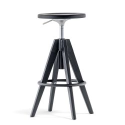 Dieser in Italien hergestellte Hocker ist drehbar und höhenverstellbar von mindestens 65 bis maximal 75,5 cm. Die runde Sitzfläche hat einen Durchmesser von 33,5 cm. Die Höhe der Fußstütze vom Boden beträgt 24 cm. Die Stellfläche des Sockels hat einen Durchmesser von 50 cm.