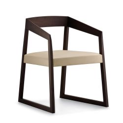 Sessel mit Armlehnen und mit geometrischem und quadratischem Design. Das Gestell ist aus massivem Eichen- oder Nussbaumholz; die seitlichen Elemente führen einen quadratischen Querschnitt vor. Die Rückenlehne und die Armlehnen sind ein einziges Element, das auf der Vorderseite schmaler wird.