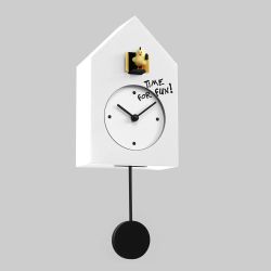 Freebird Punk ist eine Pendeluhr mit ironischem und nettem Design: Der kleine Vogel hat sich zu seiner Punk-Version mit schwarzem Wappen und einer Sprühdose entwickelt, mit der er seine Botschaft "Time for Fun" schreibt.