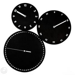 Diese Wanduhr führt drei verschiedene Scheiben vor, eine für die Stunden, eine für die Minuten und eine für die Sekunden.