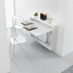 Der Tisch wird an der Wand befestigt; Es besteht aus ökologischem Laminat , einer Platte aus vollständig recycelten Holzfasern und Kunstharz.
