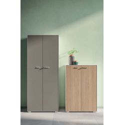 Die Aufbewahrungseinheit hat eine lackierte Aluminiumstruktur und Scharniertüren aus Melamin mit stoßfester ABS-Kante. Die Türen sind mit einem Schloss mit Schlüssel ausgestattet und die Scharniere können bis zu 105° geöffnet werden.