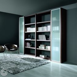 Diese Komposition hat eine Gesamtbreite von 278 cm, eine Tiefe von 44 cm und eine Höhe von 215 cm und umfasst zwei Fächer mit einer Nettobreite von 43 cm mit Glastür und passender Rückwand sowie zwei doppelseitige Fächer mit einer Nettobreite von 86 cm.