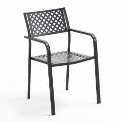 Aus lackiertem Stahl gefertigt , hat er ein Lochblechmotiv auf Sitz und Rücken, die Armlehnen runden das Design ab und machen den Stuhl besonders bequem. Wenn dieser Stuhl nicht in Gebrauch ist, kann er durch Stapeln aufbewahrt werden.