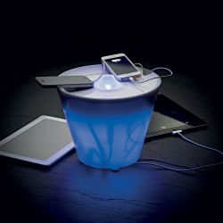 Der Deckel ist mit einem Licht ausgestattet, das den unteren Teil des Glases beleuchtet und als Ablage dient, um Gegenstände zu platzieren. Auf der Unterseite verbergen sich die Steckdosen zum Anschluss der aufzuladenden Geräte wie Smartphones und Tablets.