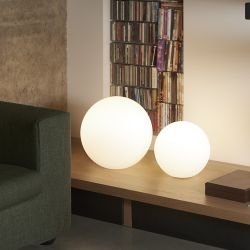 Eine perfekt kugelförmige, elegante, raffinierte und äußerst vielseitige Lampe. Globo IN ist eine moderne Leuchte aus recycelbarem Polyethylen durch Rotationsgussverfahren gefertigt, perfekt sowohl als Tisch- als auch als Stehlampe.