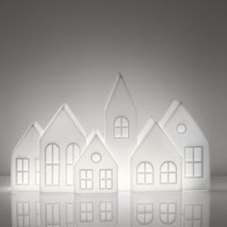 Die Silhouette der fünf kleinen Häuser mit Glockentürmen reproduziert eine typisch skandinavische Stadtlandschaft.