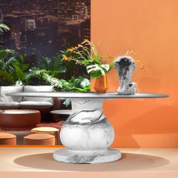 Der zentrale Sockel besteht aus Polyethylen, das in verschiedenen glänzenden und opaken Farben oder in einer marmorähnlichen Ausführung erhältlich ist. Die elliptische Platte besteht aus HPL und hat die Maße 140 x 72 cm.